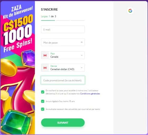 L’inscription sur le casino zaza est très simple et s’effectue en quelques minutes. Pour commencer, rendez-vous sur le site officiel de Zaza. Sur la page d’accueil, vous verrez un bouton vert où il est écrit « S’inscrire » cliquez sur ce dernier pour enclencher le processus d’inscription. Un formulaire apparaîtra, remplissez-la en fournissant vos données personnelles ainsi que la devise que vous désirez utiliser pour les transactions.
