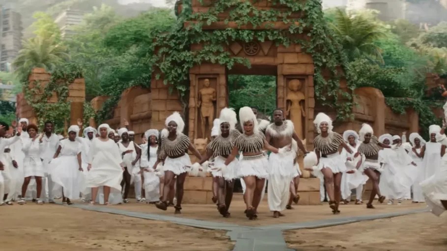 De plus, on sait que de nombreuses cultures en Afrique et aux Antilles s’habillent en blanc pour célébrer les funérailles. Or, on voit justement quelques plans avec de nombreux danseurs en blanc ainsi que Shuri, qui a en plus du maquillage blanc sur le visage, ainsi que sa mère Ramonda. On voit également la sœur de T’Challa porter ce qui semble être le casque de Black Panther durant ce qu’on dirait être une procession funéraire.