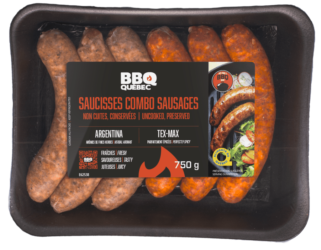 Le Combo Saucisses est le fruit d’un long travail par deux passionnés du BBQ; Max BBQ Guru et JP BBQ Master, les frères Lavoie, co-fondateurs de BBQ Québec, qui vous présentent deux saveurs inspirées des assaisonnements préférés chez BBQ Québec: Argentina (arômes de fines herbes) et Tex-Max (parfaitement épicées). Pour des saucisses fraîches, savoureuses et juteuses, le format de 750 g est plus généreux que les autres sur le marché; il y en a pour toute la famille, et pour tous les goûts!