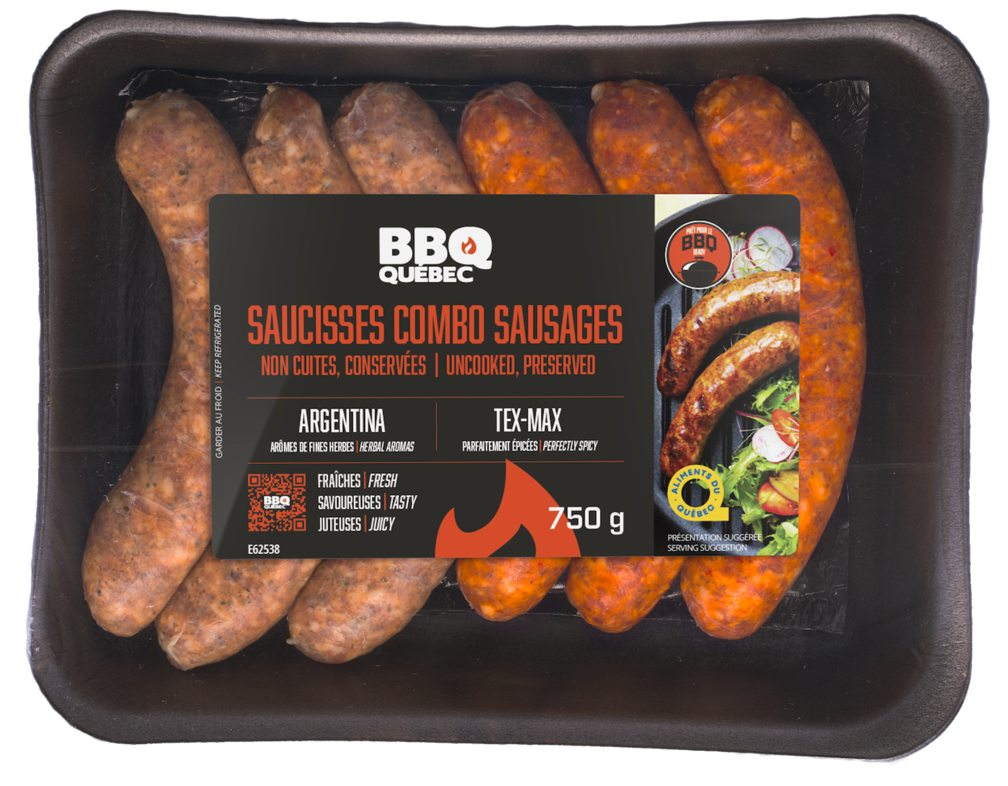 Le Combo Saucisses est le fruit d’un long travail par deux passionnés du BBQ; Max BBQ Guru et JP BBQ Master, les frères Lavoie, co-fondateurs de BBQ Québec, qui vous présentent deux saveurs inspirées des assaisonnements préférés chez BBQ Québec: Argentina (arômes de fines herbes) et Tex-Max (parfaitement épicées). Pour des saucisses fraîches, savoureuses et juteuses, le format de 750 g est plus généreux que les autres sur le marché; il y en a pour toute la famille, et pour tous les goûts!