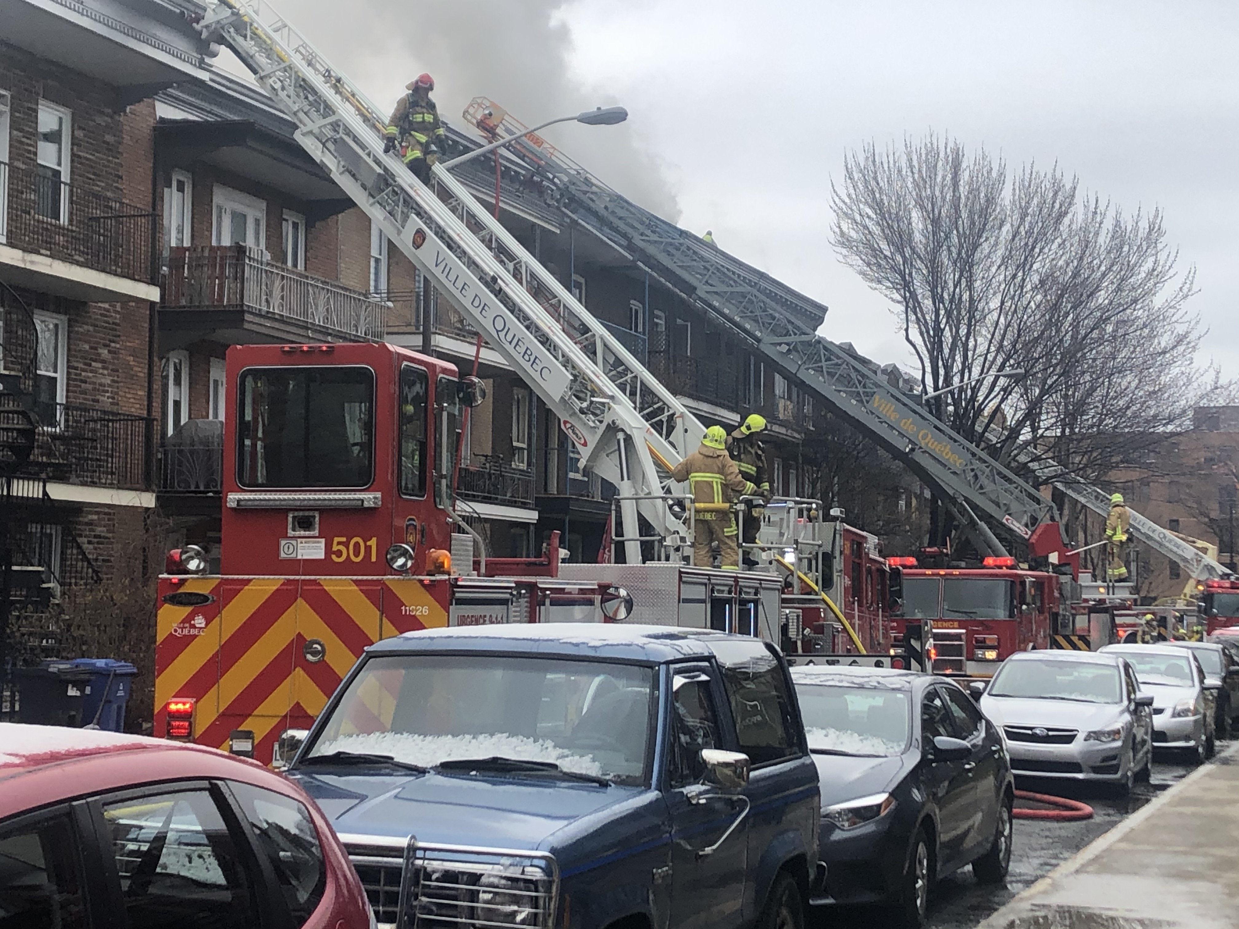 Les informations indiquaient la présence de beaucoup de fumée et des flammes à l’arrière de l’immeuble. Une colonne de fumée était visible à plusieurs kilomètres de distance. «L’incendie a débuté à l’arrière de l’immeuble et s’est propagé par les tambours (section de galerie et d’escalier recouverte). Heureusement, les gens n’ont pas tardé à évacuer les lieux et les pompiers ont pu commencer l’extinction», soulignait ce matin Alexandre Lajoie, officier aux communications pour le Service de protection contre l’incendie de la Ville de Québec.