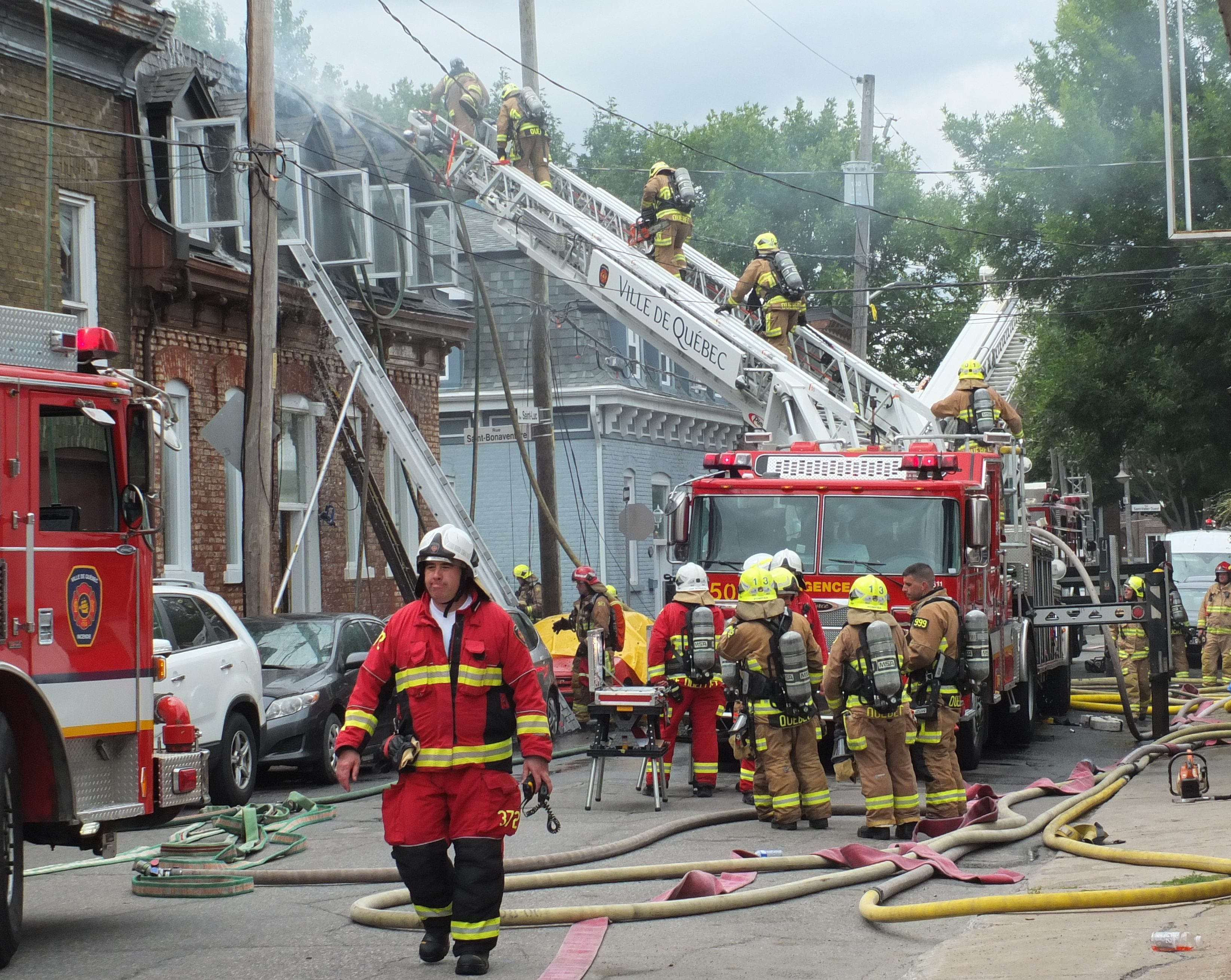 9-1-1. Un incendie nécessitant l’intervention de quelque 80 pompiers fait rage depuis 12h40 au 551 et 553, rue Saint-Bonaventure, dans le quartier Saint-Sauveur, dont la construction remonte à 1900. Des voisins ont communiqué avec la centrale 9-1-1 indiquant que des flammes s’échappaient du toit de l’immeuble.