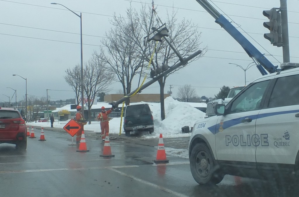 La camionnette, qui circulait en direction nord, a percuté un camion. Elle a terminé sa course sur un poteau supportant des feux de circulation. Deux véhicules patrouilles du Service de police de la Ville de Québec sont intervenus pour assurer la bonne circulation du trafic alors que les feux de signalisation de cette intersection étaient inopérants.