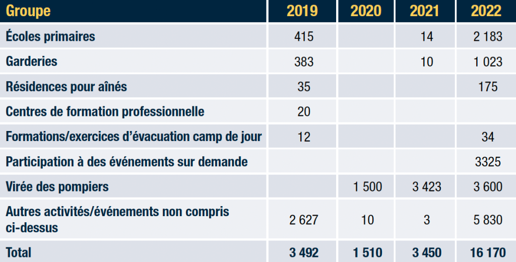 Le nombre de personnes rencontrées dans le cadre d’activités de prévention sur le terrain comme La Virée des pompiers qui se déplace dans les camps de jour ou des visites d’écoles et de résidences pour aînés a aussi explosé en 2022. Plus de 16 000 personnes ont en effet été rencontrées par les préventionnistes alors qu’il était question de seulement 3 492 personnes en 2019, avant le début de la pandémie.