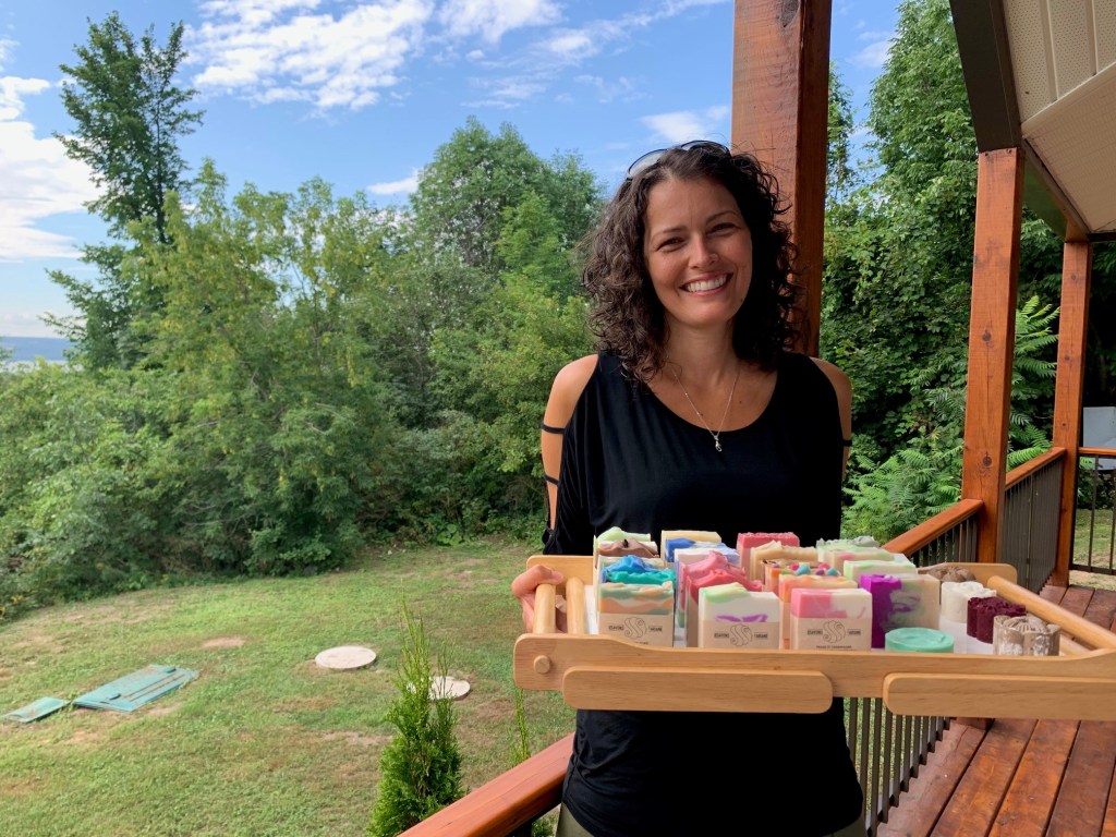 «Mes enfants font de l’eczéma et moi j’ai vraiment la peau sèche, alors ça faisait longtemps que je pensais à fabriquer des savons pour ma famille. J’ai lu beaucoup sur le sujet pour me rendre compte que c’était assez compliqué. Donc j’ai fait des cours en ligne et beaucoup de recherche pendant trois mois et ensuite j’ai commencé à faire des tests et j’ai offert mes produits à ma famille pour Noël. Ç’a été un succès, tout le monde a aimé. Ma voisine en a entendu parler et elle a lancé ça sur Facebook et l’engouement a été instantané», raconte la résidente de Château-Richer.