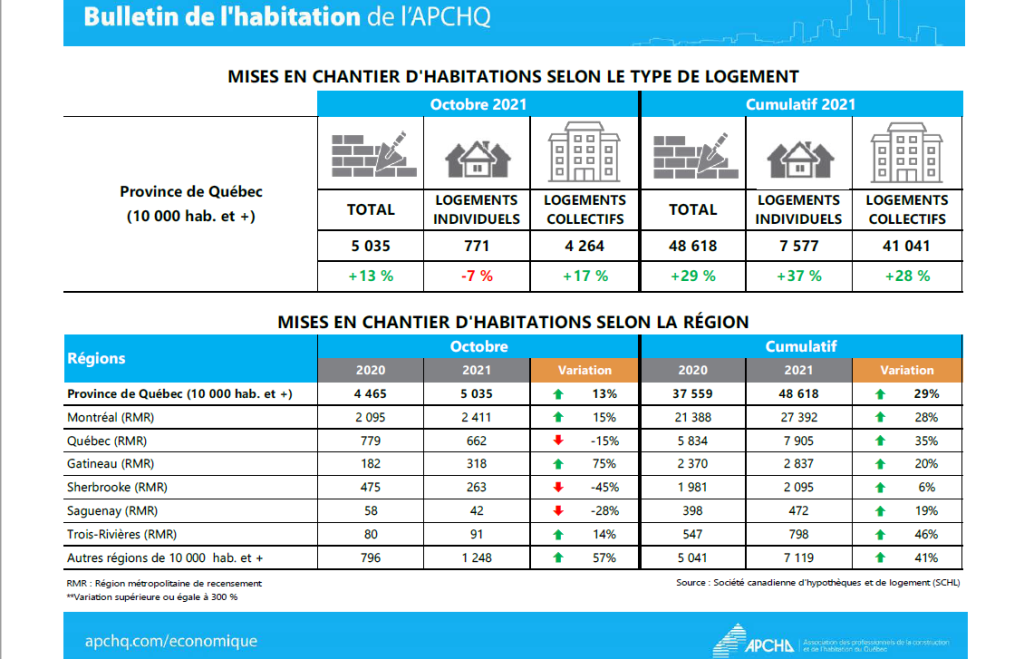 STATISTIQUES. Au cours du mois d’octobre, la Société canadienne d’hypothèques et de logement (SCHL) a recensé 5035 habitations mises en chantier au Québec. Il s’agit d’une augmentation de 13% comparativement à octobre 2020, et d’une huitième hausse mensuelle en 10 mois depuis le début de 2021.