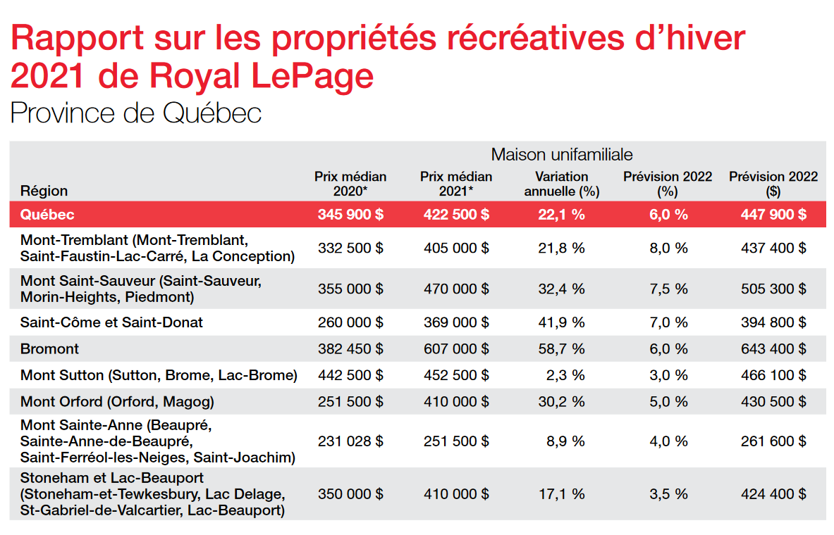 «Les abords du mont Sainte-Anne figurent parmi les marchés de villégiature réputés les plus abordables de la province. Les acquéreurs de résidences secondaires y sont nombreux et profitent d’une localisation idéale, entre Québec et Charlevoix. L’arrivée du Club Med (à Petite-Rivière-Saint-François) promet aussi d’accroître l’engouement pour le tourisme et la location à court terme dans la région», souligne Michèle Fournier, vice-présidente Royal LePage Inter-Québec. Une progression de 4% est anticipée en 2022.