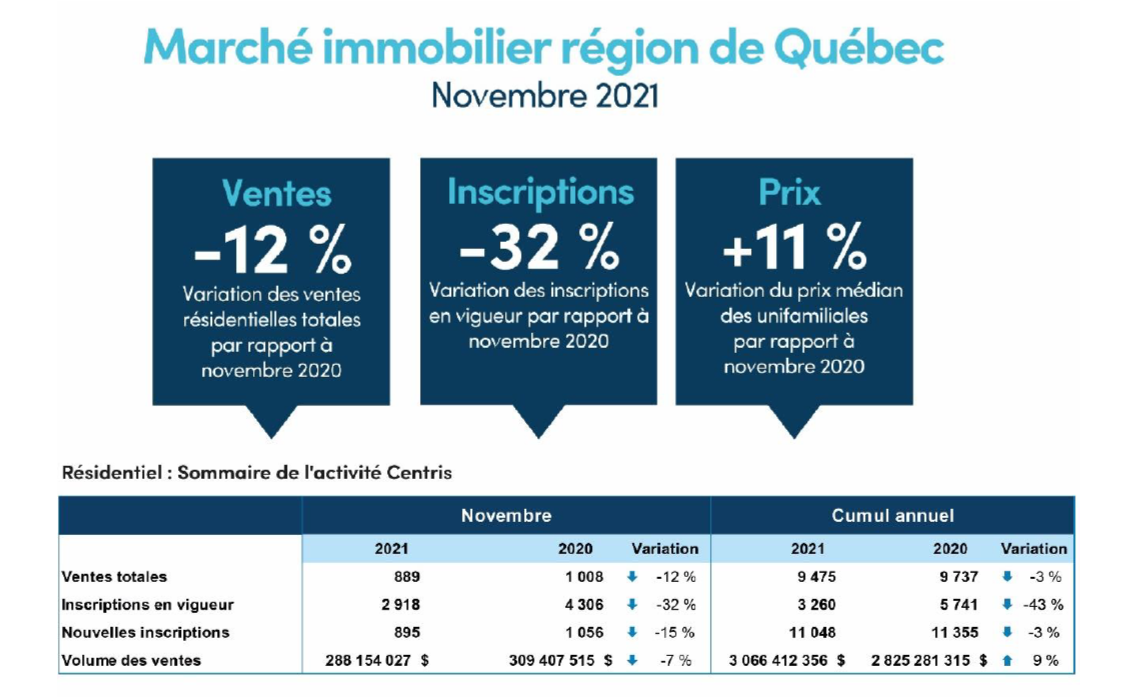 «Le mois de novembre 2021 affiche une baisse des transactions par rapport à un mois de novembre 2020, qui fut exceptionnel. Or, il ne faut pas s’y tromper, il s’agit d’un mois de novembre qui s’avère le deuxième plus actif jamais enregistré depuis que les données de marché sont cumulées. On peut le comparer au mois de novembre prépandémique de 2019, et ce, malgré un niveau d’inscriptions en vigueur divisé par trois par rapport à cette période», remarque Charles Brant, directeur du Service de l’analyse du marché à l’APCIQ.