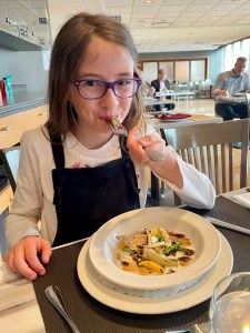 Du premier au dernier plat, elle a tout aimé. Même le scorpion de Mandchourie servi avec avocat, concombre, tomate et tortilla. Il faut l’avouer, ça demandait un certain courage et c’est bien parce qu’elle ne pouvait que suivre son exemple que sa mère a mis à son tour la bête dans sa bouche, non sans l’avoir préalablement découpée un peu, pour la rendre moins apeurante! «J’ai beaucoup aimé les gougères aux grillons et gruyère, c’était délicieux! Ça ne me fait pas peur de manger des bibittes. C’est sûr que c’est pas très beau, mais c’est le bon goût qui compte et puis ça a un petit côté croustillant qui est amusant. Je pense que c’est important pour la planète alors tout le monde devrait au moins essayer.» Que dire de plus!