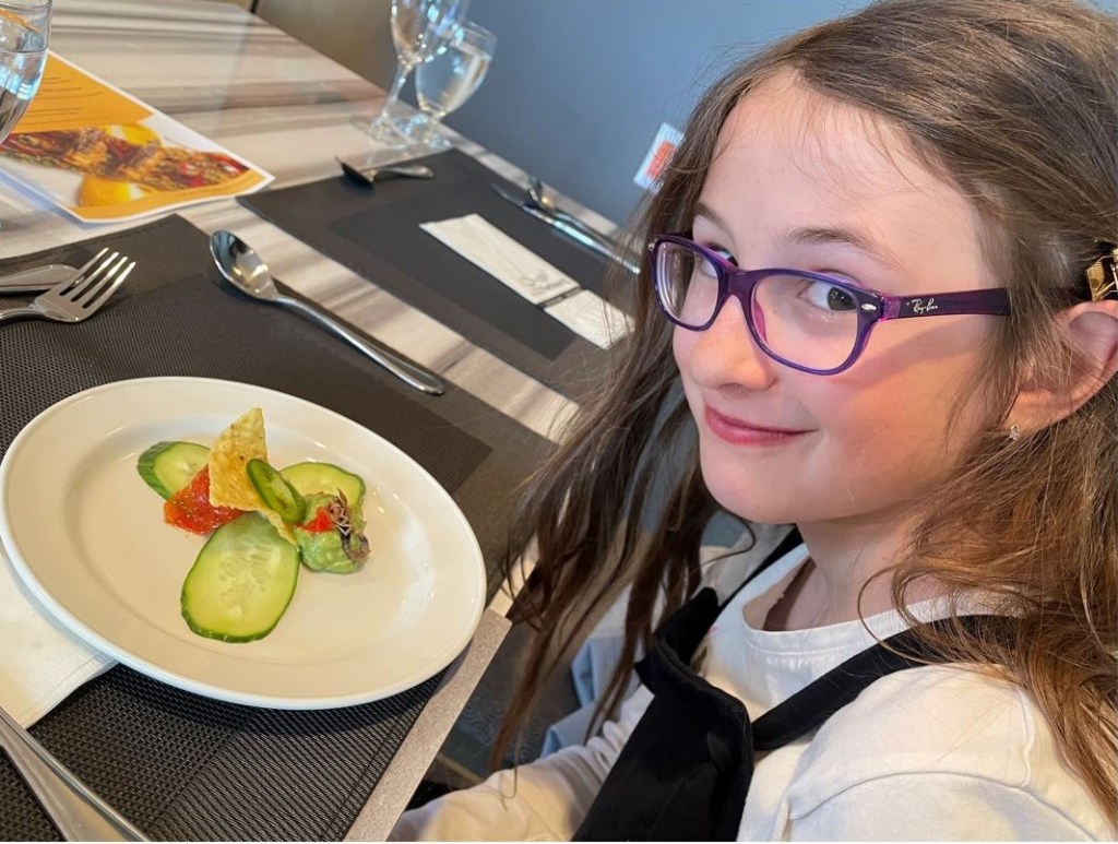 Du premier au dernier plat, elle a tout aimé. Même le scorpion de Mandchourie servi avec avocat, concombre, tomate et tortilla. Il faut l’avouer, ça demandait un certain courage et c’est bien parce qu’elle ne pouvait que suivre son exemple que sa mère a mis à son tour la bête dans sa bouche, non sans l’avoir préalablement découpée un peu, pour la rendre moins apeurante! «J’ai beaucoup aimé les gougères aux grillons et gruyère, c’était délicieux! Ça ne me fait pas peur de manger des bibittes. C’est sûr que c’est pas très beau, mais c’est le bon goût qui compte et puis ça a un petit côté croustillant qui est amusant. Je pense que c’est important pour la planète alors tout le monde devrait au moins essayer.» Que dire de plus!