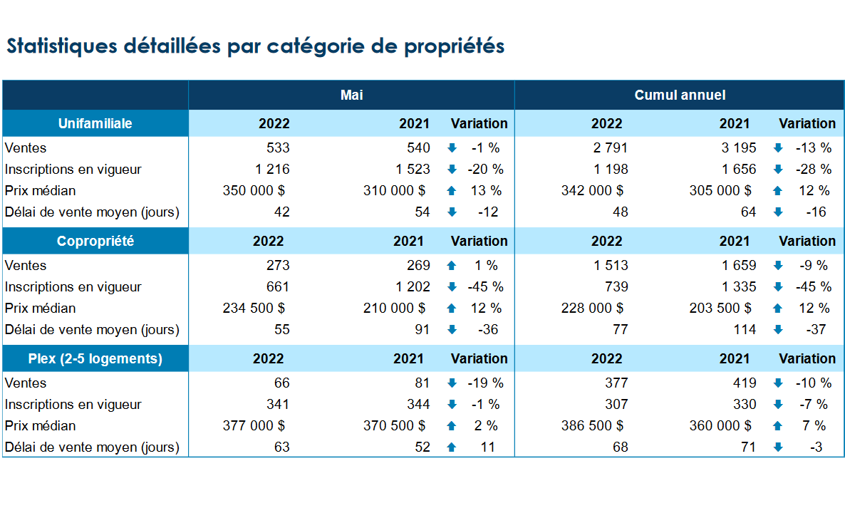 - La stabilité des ventes par rapport à mai 2021 a été visible dans les catégories des unifamiliales et des copropriétés, qui ont connu un déclin de 1% et un gain de 1% respectivement. Les petites propriétés à revenus, un marché plus volatil dû à sa petite taille, a toutefois enregistré un déclin plus important, atteignant 66 reventes, soit 19% de moins qu’en mai 2021.
