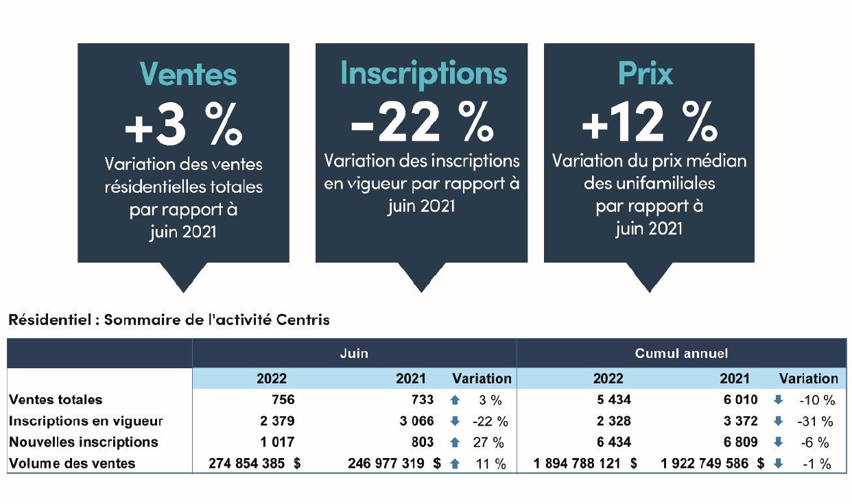 - S’inscrivant dans la tendance provinciale de regain progressif des inscriptions en vigueur, le nombre de propriétés disponibles dans le marché de la région de Québec a atteint 2379 en juin. Il s’agit néanmoins d’une diminution de 22% comparée à juin 2021.