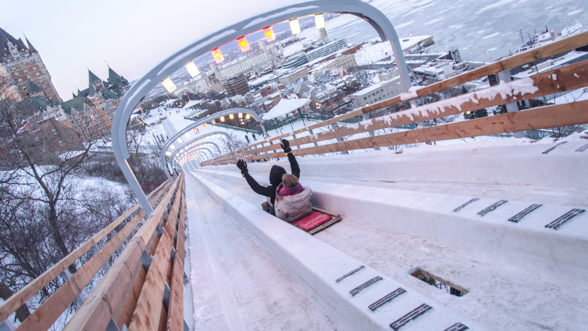 -La glissade de la terrasse Dufferin. Les luges peuvent accueillir jusqu’à 4 personnes. À essayer en famille ou pour faire la course entre amis. Ouverture prévue le 18 décembre.