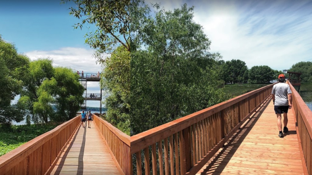 Des aires de repos et d’observation ainsi qu’une tour haute de 12 m sont aménagées à même cette passerelle qui donne sur le Lac St-Pierre. Les couchers de soleil y sont impressionnants.