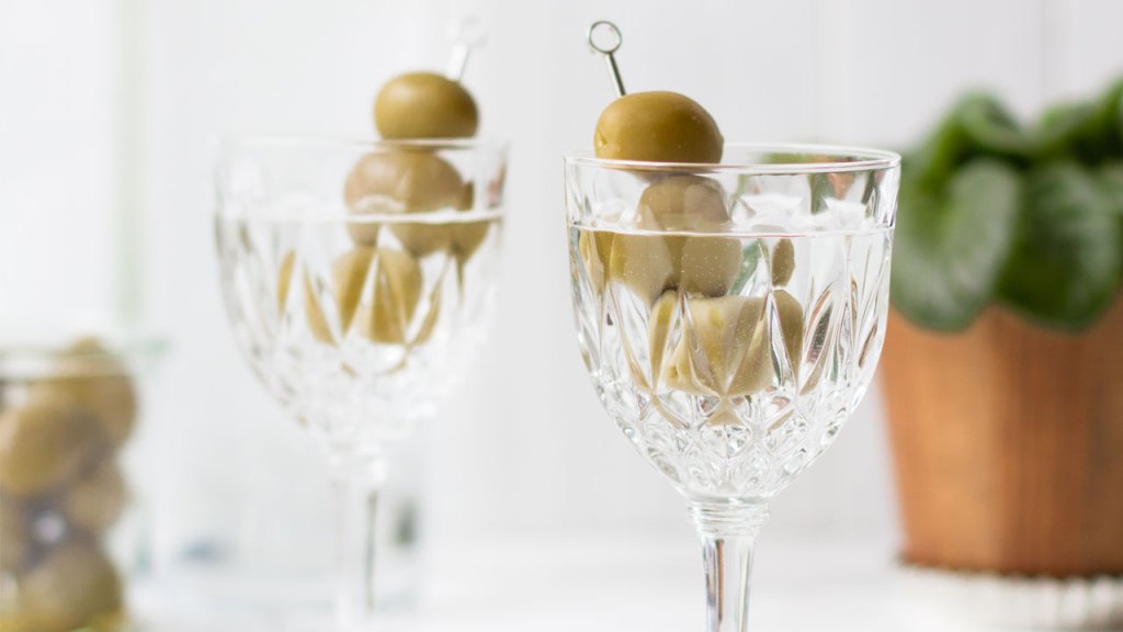 - Décorer d’une olive sur un pic à cocktail et exprimer le zeste d’un citron sur le verre.