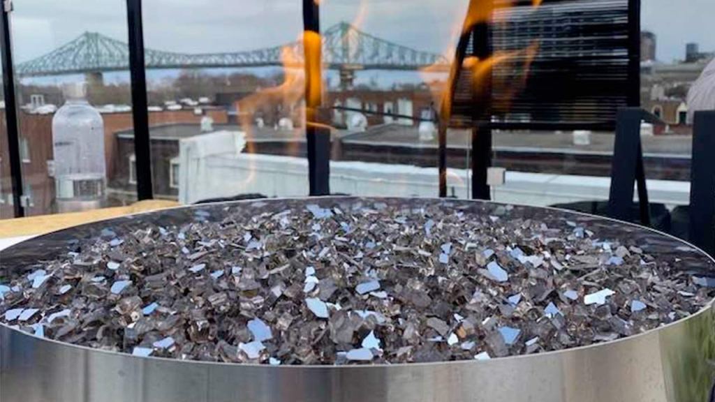 Qui l’eût cru? On peut installer un véritable foyer qui fait une belle flamme de façon sécuritaire au beau milieu d’une table en bois ou sur le plancher en bois traité de la terrasse!