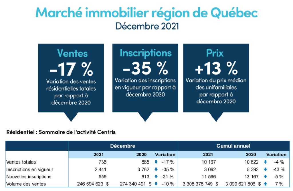 - Au cumul de l’année 2021, les reventes ont connu un repli relatif de 4% à Québec avec 10 197 transactions. Il s’agit de la deuxième année la plus active enregistrée par le système Centris des courtiers immobiliers après l’année exceptionnelle de 2020 à ce chapitre.