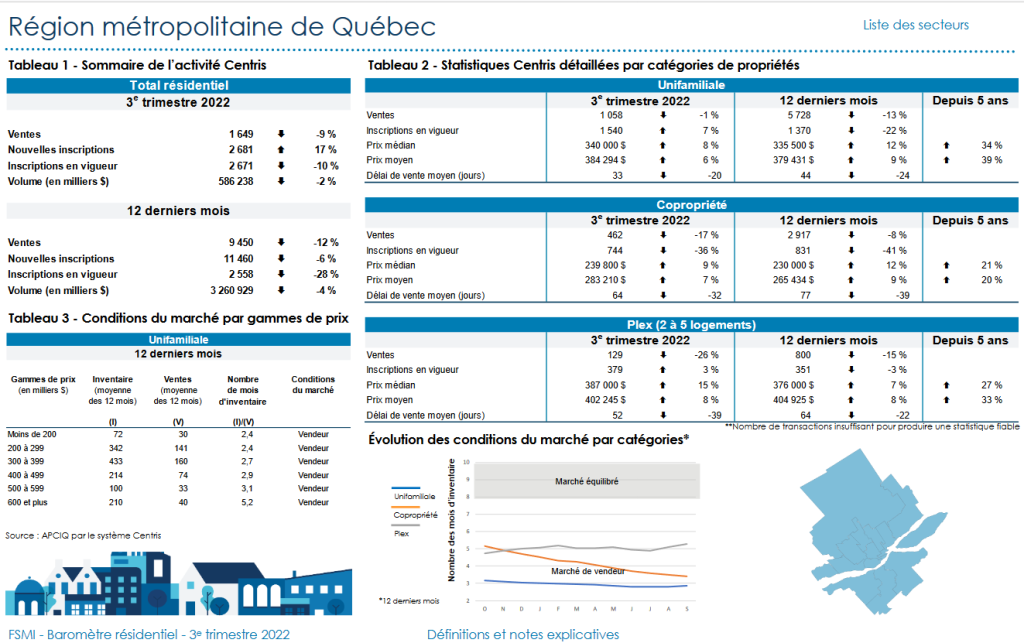 Étant donné les conditions de marché toujours serrées, la pression sur les prix dans la région de Québec s’est maintenue au 3e trimestre. Le prix médian des unifamiliales a enregistré une hausse de 8% par rapport à la même période l’an passé, s’établissant à 340 000$. Cela représente toutefois 9000$ de moins qu’au 2e trimestre 2022, indiquant une stabilisation du marché. Cependant, les copropriétés ont connu un gain de 9% par rapport à l’an passé, atteignant 239 800$, soit une hausse de plus de 4800$ sur une base trimestrielle consécutive. Les petites propriétés à revenus ont enregistré la hausse la plus importante, soit de 15% pour un prix médian de 387 000$.