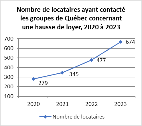 Il s’agit d’un niveau inégalé jusqu’à maintenant. «À ce jour en 2023, déjà 200 personnes de plus que durant toute l’année dernière ont utilisé les services des groupes de défense des droits des locataires, à la suite de la réception de leur avis d’augmentation de loyer. Depuis 2020, le nombre de demandes est en constante augmentation», observe la Coalition de Québec contre les hausses de loyer.