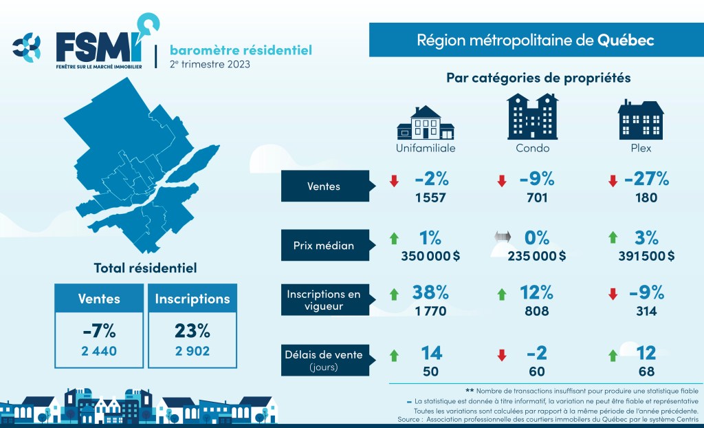 La région de Québec a enregistré 2440 transactions résidentielles au 2e trimestre de 2023. Cela représente une baisse de 7% comparativement à la même période en 2022. Il s’agit tout de même d’un niveau de reventes supérieur à la moyenne historique.