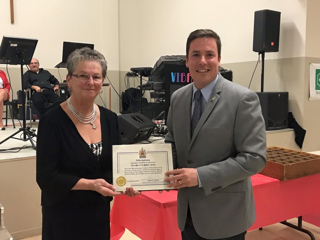 La fondation du Club d’Âge d’Or a célébré son 50e anniversaire de fondation au sous-sol de l’église de Giffard. La présidente, Céline Pageau, a reçu des mains du député fédéral de Beauport-Limoilou un certificat de la Chambre des communes.