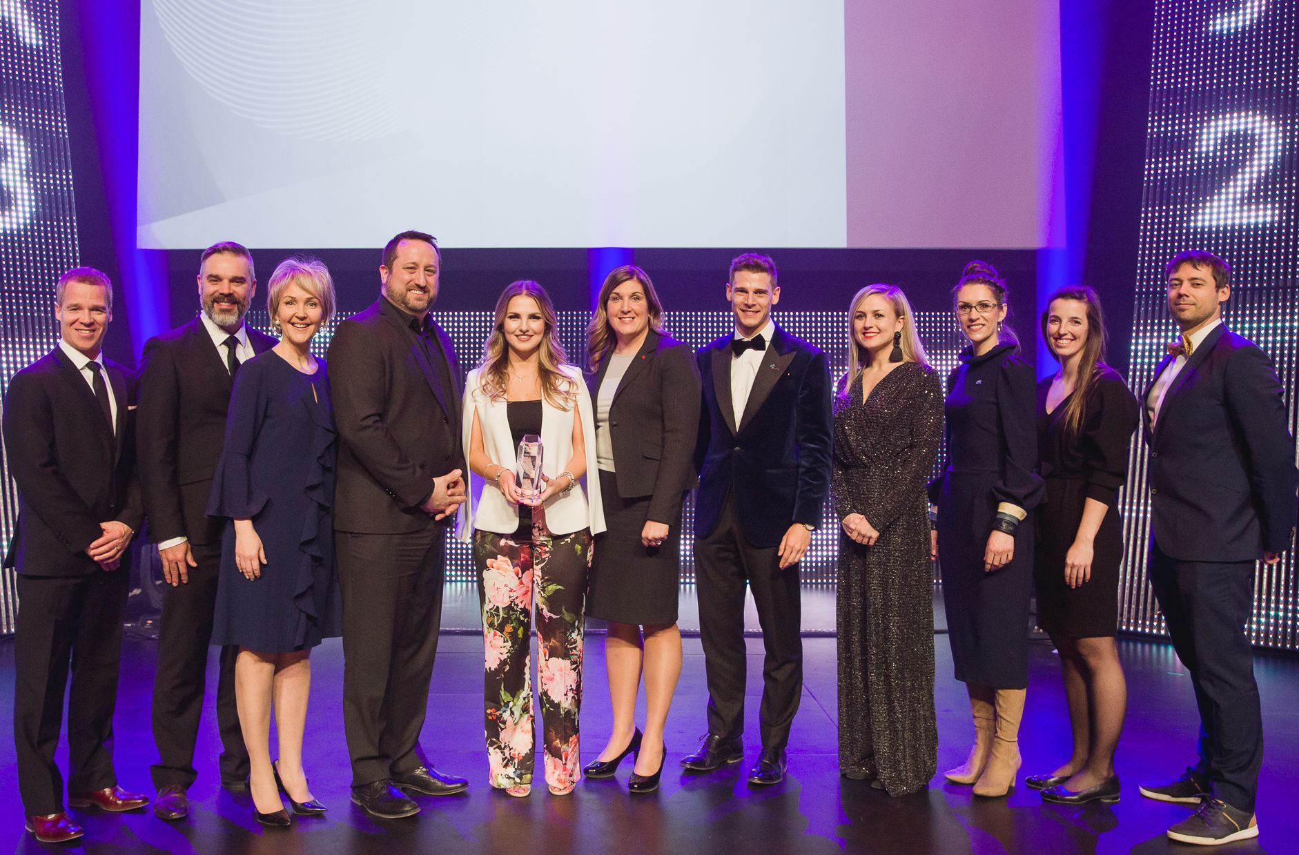 MÉRITE. À l’occasion du 27e Gala jeune personnalité d’affaires (Gala JPA), organisé par la Jeune chambre de commerce de Québec (JCCQ), Anja Okuka (au centre) a été doublement récompensée. Elle a en effet reçu le titre de Jeune personnalité d’affaires 2018, dans la catégorie «Commerce de détail», ainsi que le prix Coup de cœur Banque Nationale.