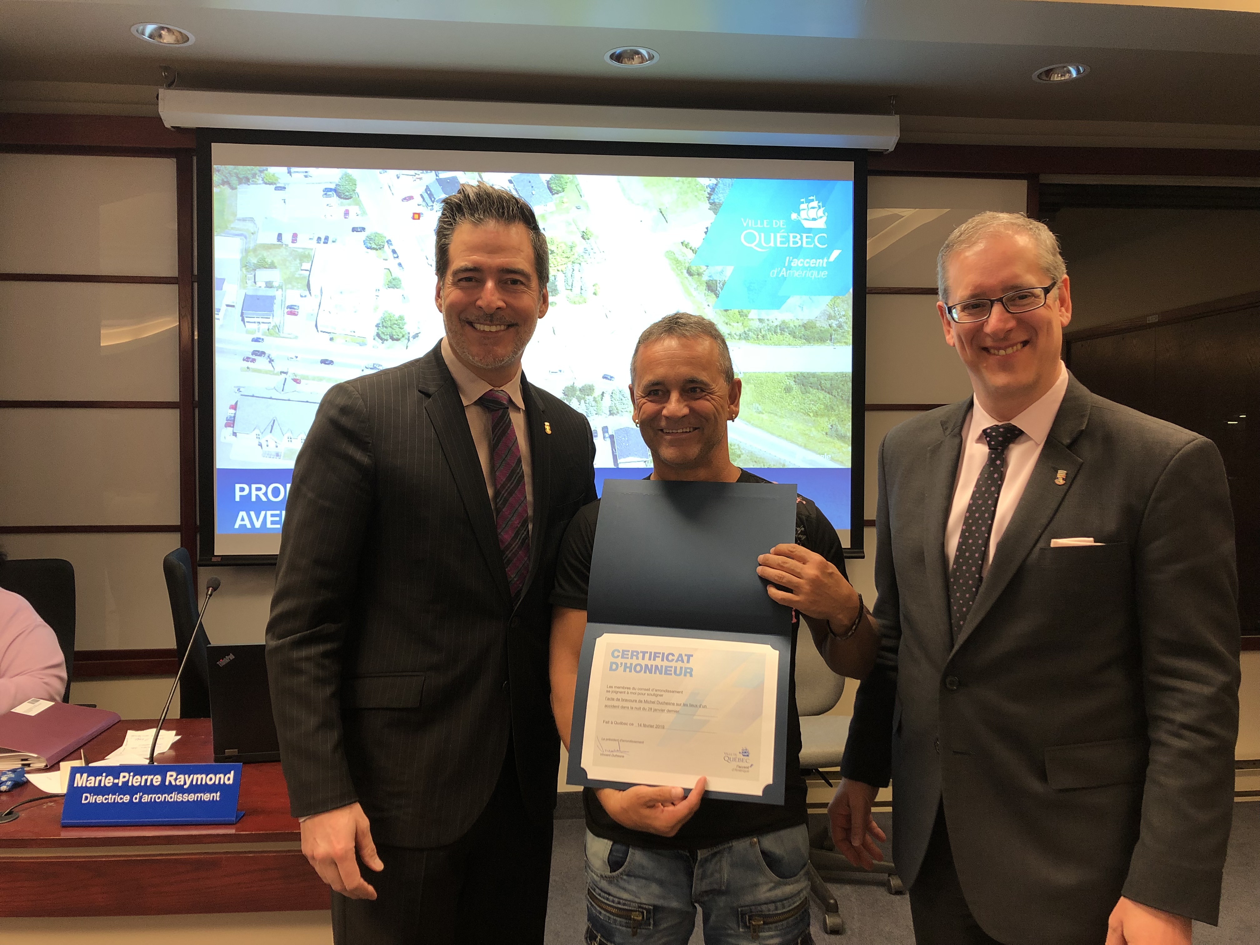 «On veut absolument, par voie de résolution, offrir à Michel Duchesne nos plus sincères félicitations pour son acte de bravoure qui a sauvé la vie d’un automobiliste à Charlesbourg. […] Ce sont des gens comme toi qui font la différence. Je souhaite être sur ton chemin un jour si je suis en péril», a blagué le conseiller et président de l’arrondissement de Charlesbourg Vincent Dufresne, qui connaît personnellement le courageux citoyen car il est employé à la Ville.