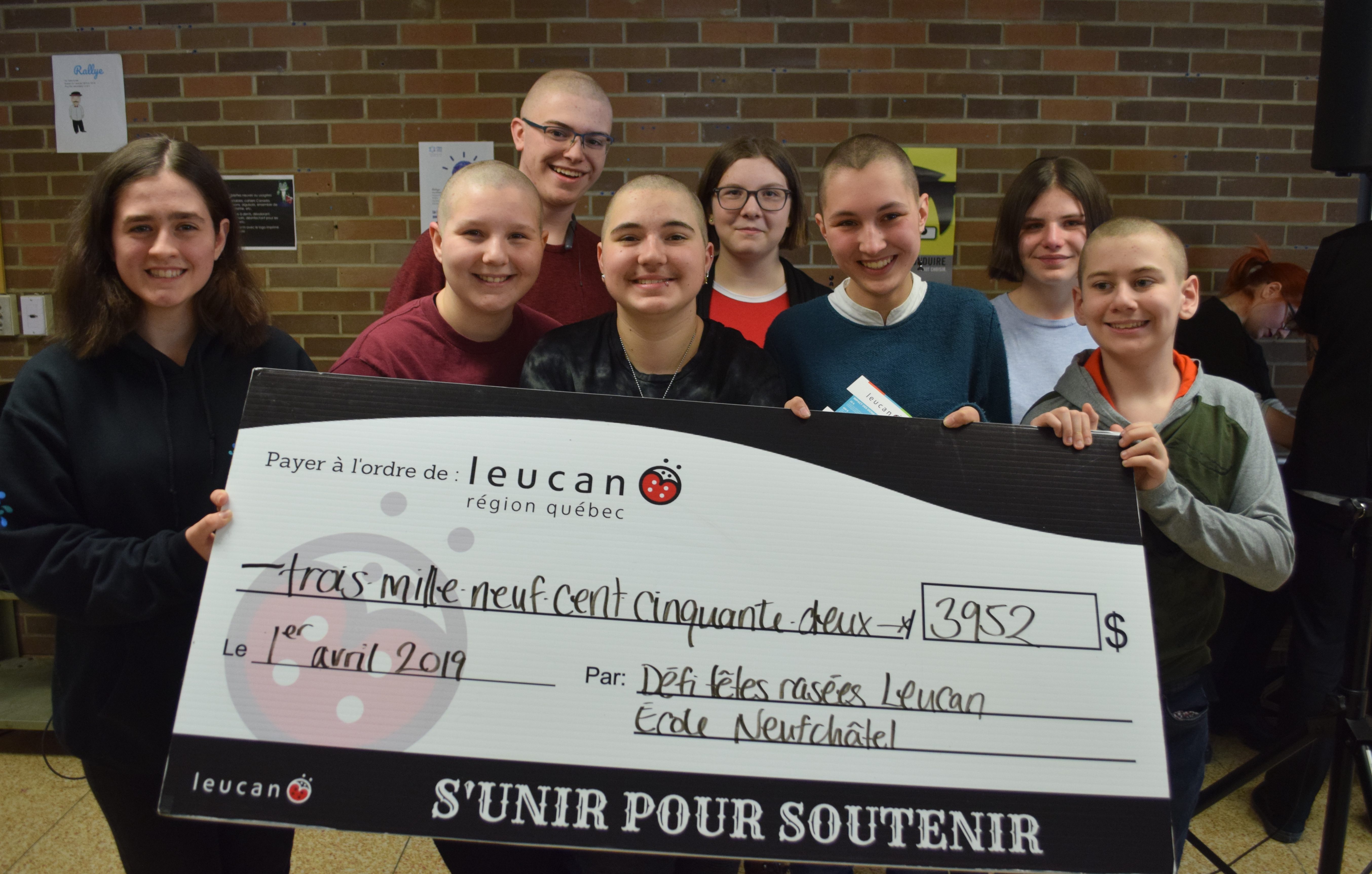 ÉVÉNEMENT. C’est dans un hall d’entrée comble d’étudiants et d’enseignants que l’École secondaire Neufchâtel a révélé avoir amassé 3952$ pour le Défi têtes rasées de Leucan et le Défi coupe ta couette qui se déroulaient ce midi. L’établissement scolaire a donc largement dépassé l’objectif de 2000$.