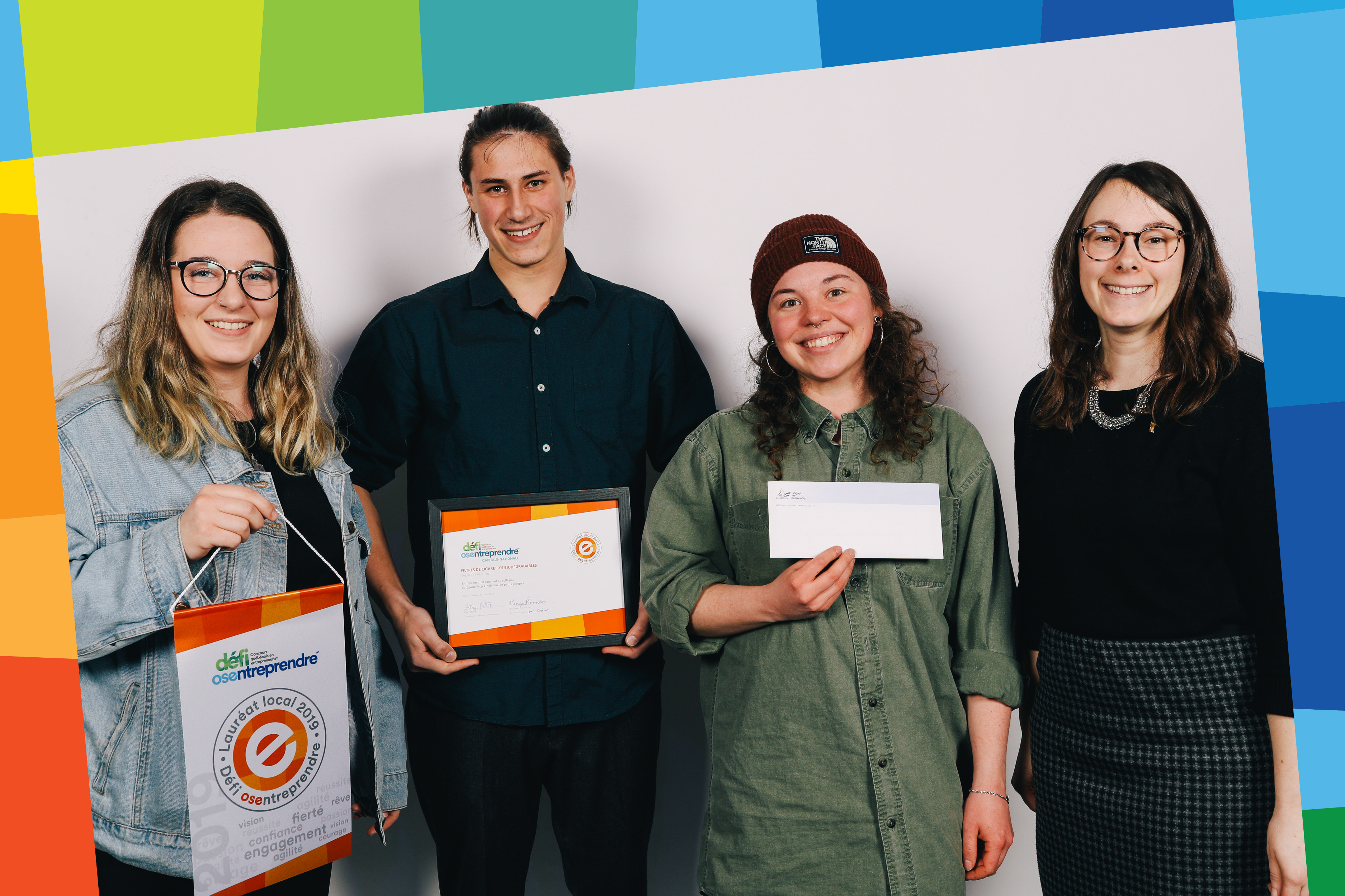 Cinq étudiants du Cégep de Sainte-Foy ont été récompensés lors de la finale locale collégiale du Défi OSEntreprendre Capitale-Nationale le 2 avril dernier. Vincent Blouin (ci-haut, au milieu) a reçu le prix «Projet individuel et petits groupes» pour son projet «Filtres de cigarettes biodégradables» qui vise à diminuer l’impact écologique des mégots de cigarettes. Pour sa part, l’équipe de Camille Montour, Alexia Labrecque, Sarah Pilote et Louis-Philippe Thibeault (ci-dessous) a été sélectionnée pour la catégorie «Projet collectif» pour leur application environnementale «Dbut». Les utilisateurs de cette application doivent effectuer des défis en lien avec la préservation de l’environnement. Les lauréats participeront au Gala régional le 1er mai prochain, à l’Espace Dalhousie.