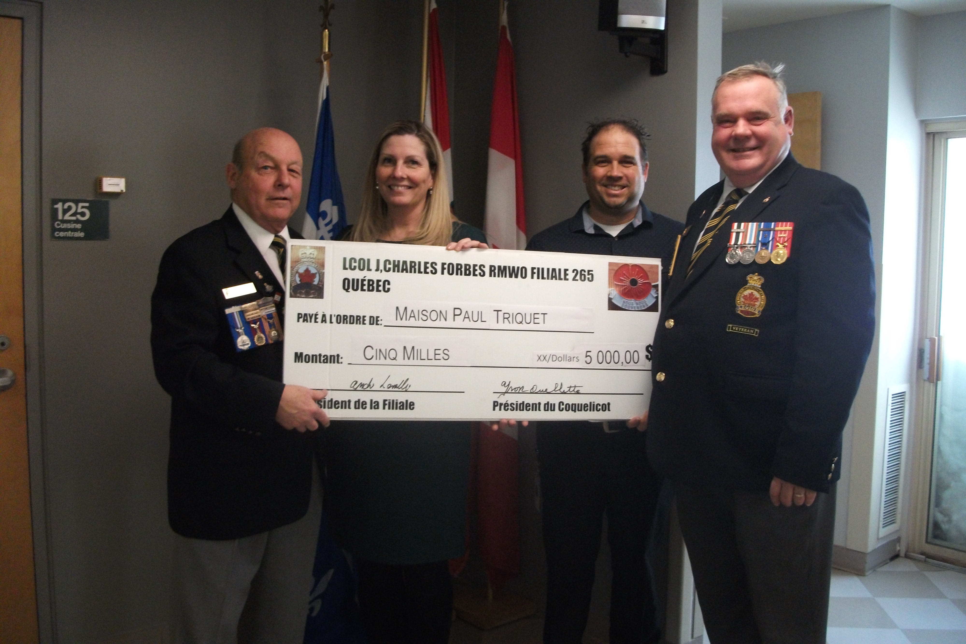 Dernièrement, le Comité du Coquelicot de la Filiale 265, Lt. Col. Jean-Charles Forbes, RMWO, Québec a remis un chèque 5 000$ à la Maison Paul-Triquet, soit la Maison des Anciens Combattants à Québec. Ce CHSLD a 61 lits réservés pour les anciens combattants de la Seconde Guerre mondiale, celle de la Corée et, depuis peu, pour une nouvelle génération de vétérans.