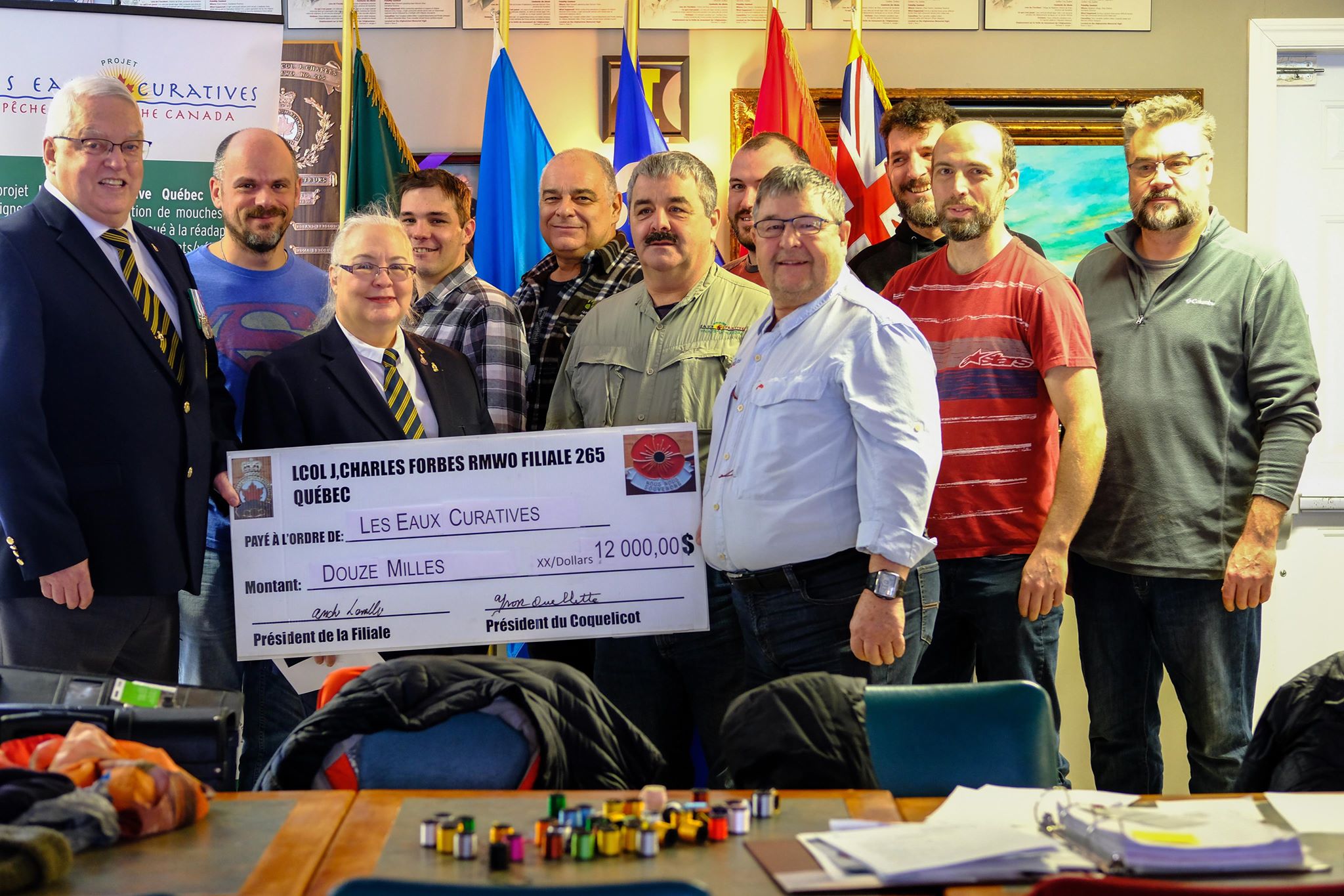 Récemment, le Comité du Coquelicot de la Filiale 265, Lt. Col. Jean-Charles Forbes, RMWO, Québec a remis un chèque de 12 000$ au projet Les Eaux Curatives par le pêche à la mouche. Ce projet a pour but d’aider à la réadaptation des militaires qui ont été blessés physiquement ou psychologiquement lors des différents déploiements auquel le Canada a participé. En leur enseignant l’art de la pêche à la mouche, les participants apprennent à reprendre confiance en eux et à créer des liens avec la nature. La pêche est un calmant naturel et plusieurs personnes se servent de ce sport pour échapper à la routine quotidienne, pour relaxer et pour reprendre des forces. Le projet atteint les mêmes buts.