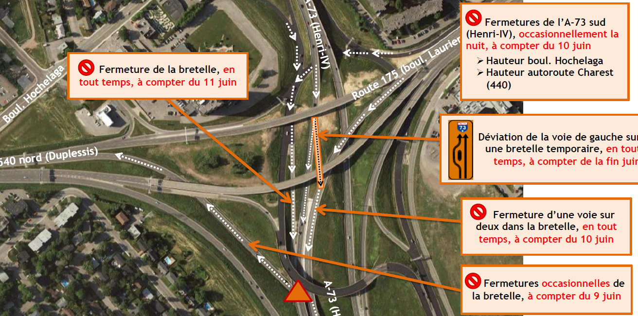 Il y aura également fermeture de la bretelle provenant du boulevard Hochelaga et de la voie de desserte du boulevard Laurier Ouest pour l’autoroute Henri-IV pour toute la durée des travaux à compter du mardi 11 juin. Le détour se fera par l’autoroute Duplessis Nord, le chemin des Quatre-Bourgeois et l’autoroute Duplessis Sud.