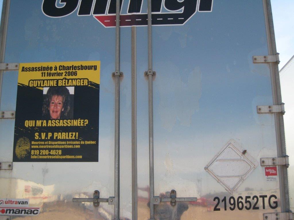 VISIBILITÉ. Depuis quelques jours, le visage de Guylaine Bélanger, assassinée à Charlesbourg en 2006, est visible sur les routes de la province puisqu’un transporteur de la Beauce a installé des affiches de personnes disparues sur 30 de ses remorques. Depuis le mois d’avril, Transport Gilmyr, un transporteur de Montmagny, a installé des affiches de personnes disparues ou assassinées dont l’affaire n’a pas été résolue par les services de police.
