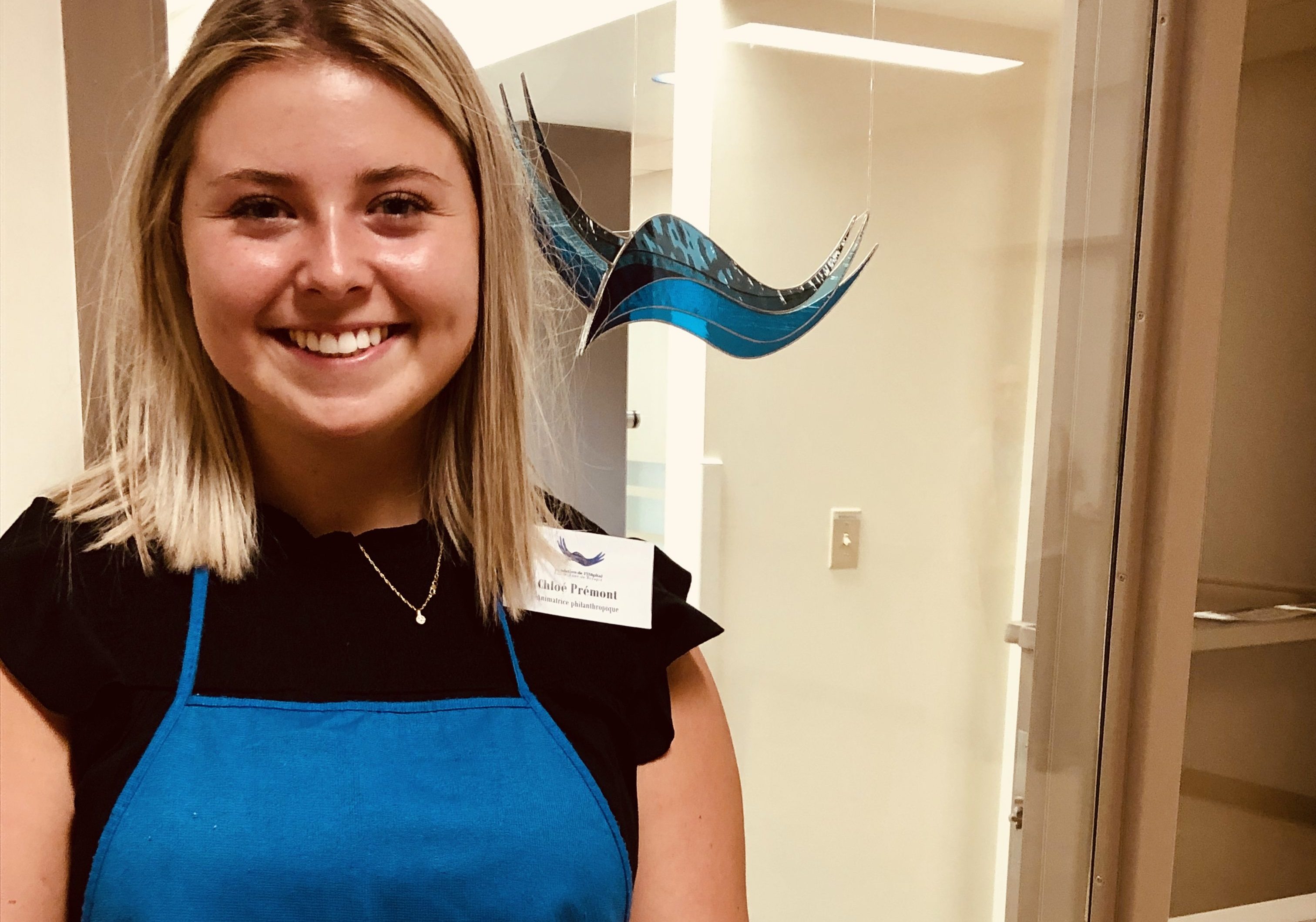 Le mandat de Chloé Prémont est d’accompagner les résidents du CHSLD, d’offrir des douceurs aux proches des personnes en soins palliatifs, de reconnaître le travail des employés de l’Hôpital, en plus de coordonner les bénévoles qui enjolivent les quatre cours extérieures. Pour ce faire, elle effectue des visites d’amitié aux 160 résidents avec lesquels elle peint, leur fait des manucures ou les amène se promener dans les jardins. Du temps de qualité, individualisé, afin de créer des liens personnalisés.