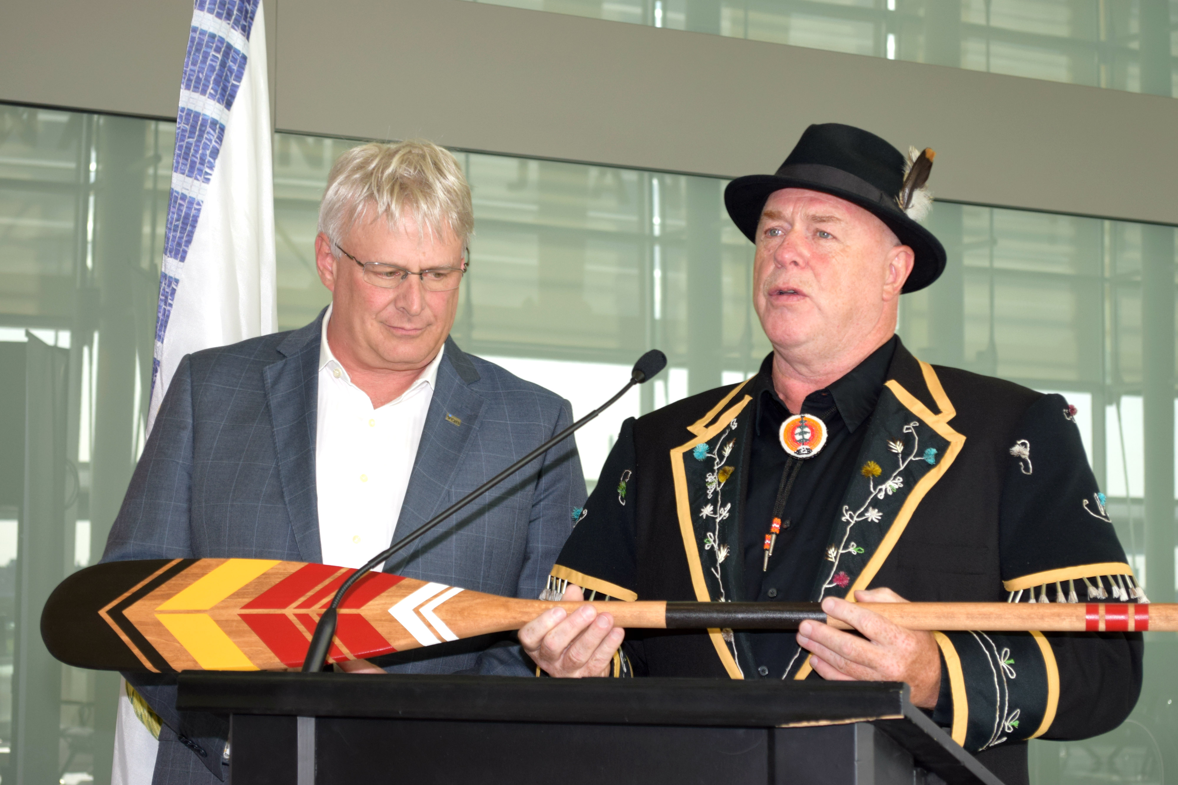 PATRIMOINE. Le président et chef de la direction de l’Aéroport international Jean-Lesage de Québec (YQB), Stéphane Poirier, et le grand chef de la Nation huronne-wendat, Konrad Sioui, ont procédé ce matin à l’inauguration de l’Espace Wendake qui représente le Nionwentsïo. Ce nouvel aménagement, installé dans la zone des arrivées internationales, est inspiré de la richesse culturelle huronne-wendat.
