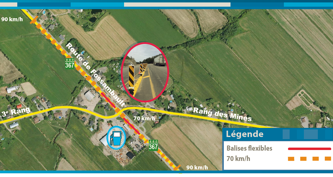 «Cette nouvelle mesure permettra de réduire les manoeuvres de virage à gauche et les risques d’accidents graves. De plus, l’installation des balises sera jumelée à l’abaissement de la limite de vitesse de 90 à 70km/h, sur une distance de 665 mètres. Ces interventions contribueront à diminuer les accidents et à améliorer la sécurité des usagers de ce secteur, d’ici à ce que des solutions permanentes soient mises en place», précise le MTQ.
