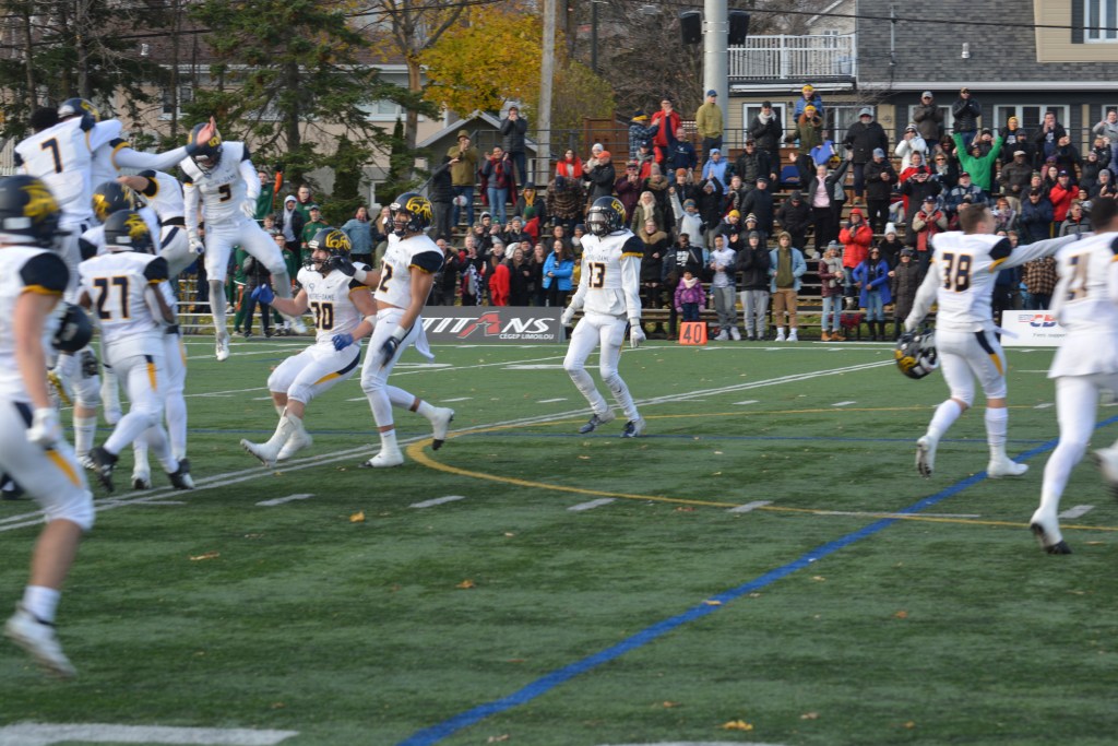 Après avoir vu les Titans contrôler l’horloge en première demie, la défensive du CNDF s’est levée et a rendu les choses difficiles pour son adversaire au niveau terrestre en deuxième demie. «Pour moi, c’est là que le match s’est joué. Nous avons été en mesure de stopper le sol et par la suite nous avons créé des revirements. Les gars ont fait des jeux dont Jean-Sébastien Lamothe qui a terminé avec trois interceptions», termine le pilote qui affichait un large sourire après la rencontre.
