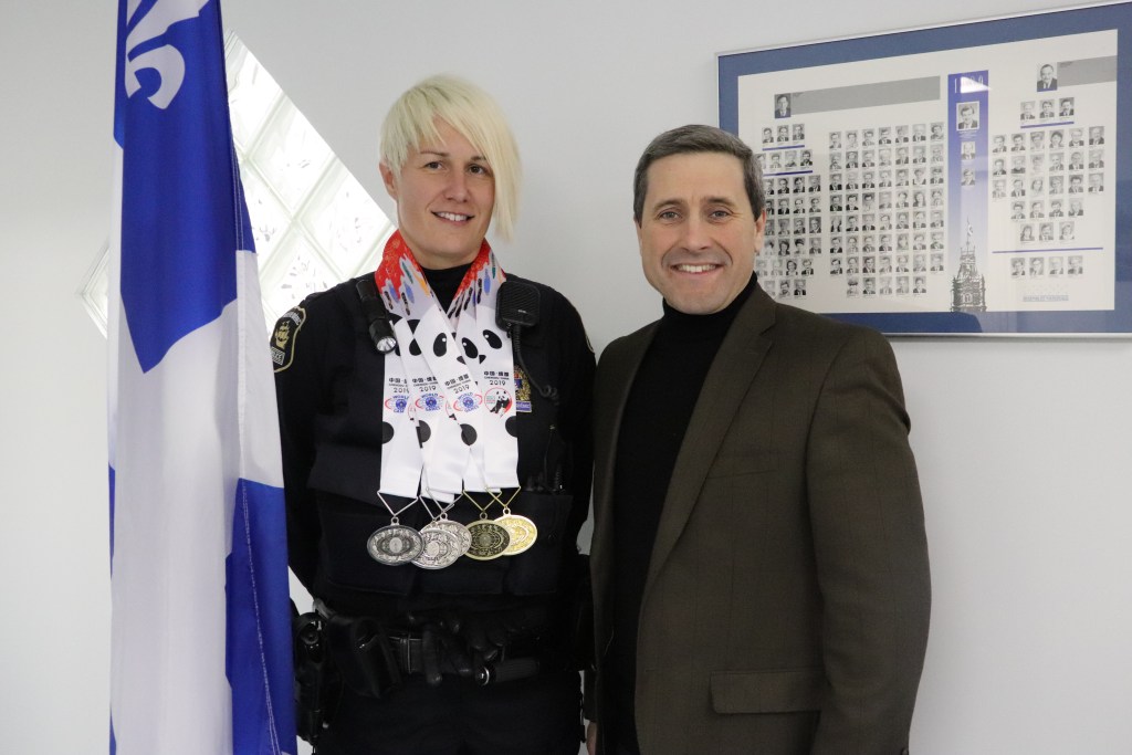 Distinction. Le député provincial Jean-François Simard a souligné les performances sportives de la policière Sany Delagrave à son bureau de comté. La policière qui patrouille sur le territoire beauportois a récolté cinq médailles aux Jeux mondiaux des policiers et pompiers qui se déroulaient à Chengdu, en Chine. La nageuse venait même de subir une intervention chirurgicale au genou, mais cela ne l’a pas empêchée de ramener la médaille d’or au 100 mètres dos en plus de trois médailles d’argent et une de bronze. «Elle est une personne hors du commun, une athlète de calibre international, une policière méritoire, une actrice reconnue et une citoyenne exemplaire», assure le député de Montmorency.