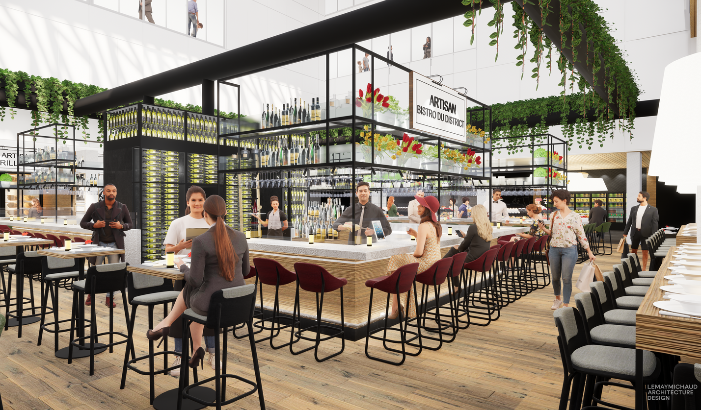 Implanté dans un atrium vitré de 35 000 pieds carrés, Le District Gourmet promet une offre alimentaire complète et diversifiée incluant des artisans, une école culinaire et un marché d’alimentation. Offrant 670 places assises à l’intérieur ainsi qu’en terrasse durant l’été, l’endroit regroupera une vingtaine de commerces, dont des restaurants, une microbrasserie, un bar à vin et à tapas, une boulangerie et une pâtisserie.