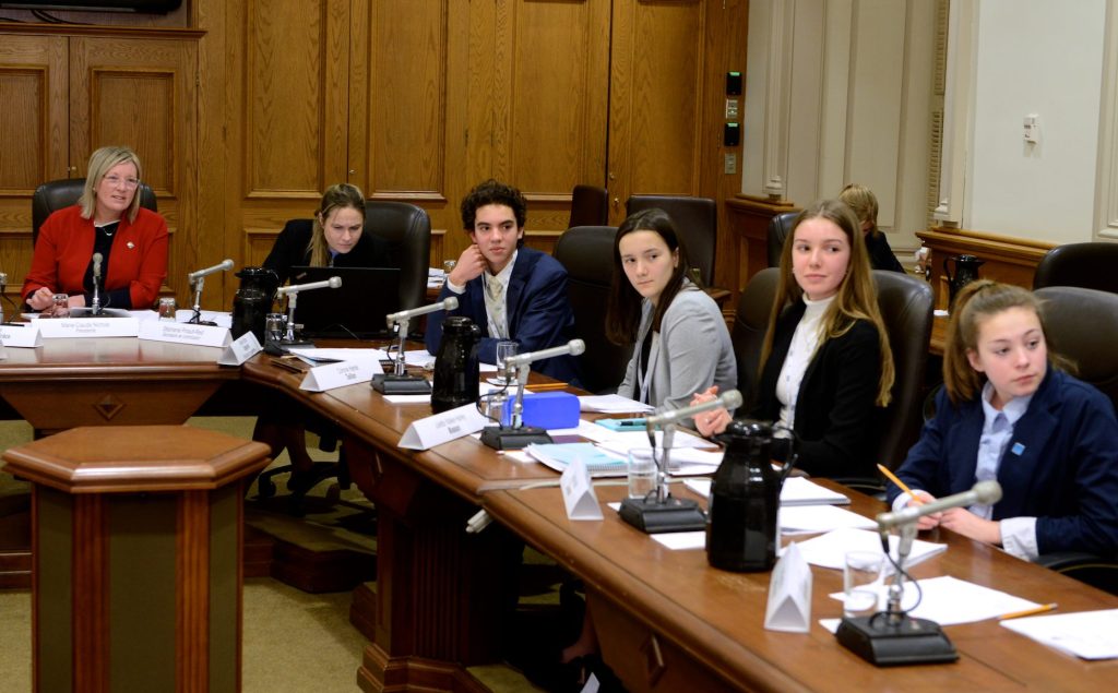 Charles Roy, élu président du Parlement des jeunes, a veillé au bon fonctionnement des procédures, en plus d’assurer le respect du décorum. Chacun des participants a siégé dans une commission parlementaire afin de vivre les différentes étapes du processus législatif et débattre des projets de loi.