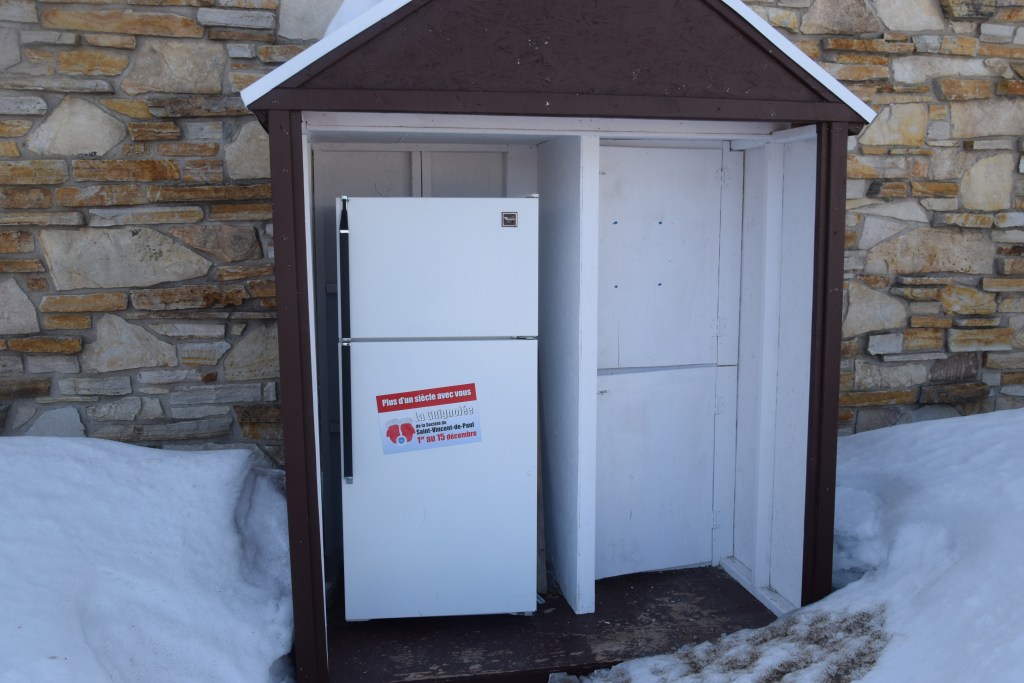 Le frigo-partage, proposé par Soupe et Cie, demeure accessible en tout temps. Natacha Theriault indique que pour chaque six soupes achetées, une 7e est donnée et placée dans le réfrigérateur. Installé dans un quartier défavorisé, le frigo-partage communautaire est un baume pour les personnes qui vivent durement cette pandémie.