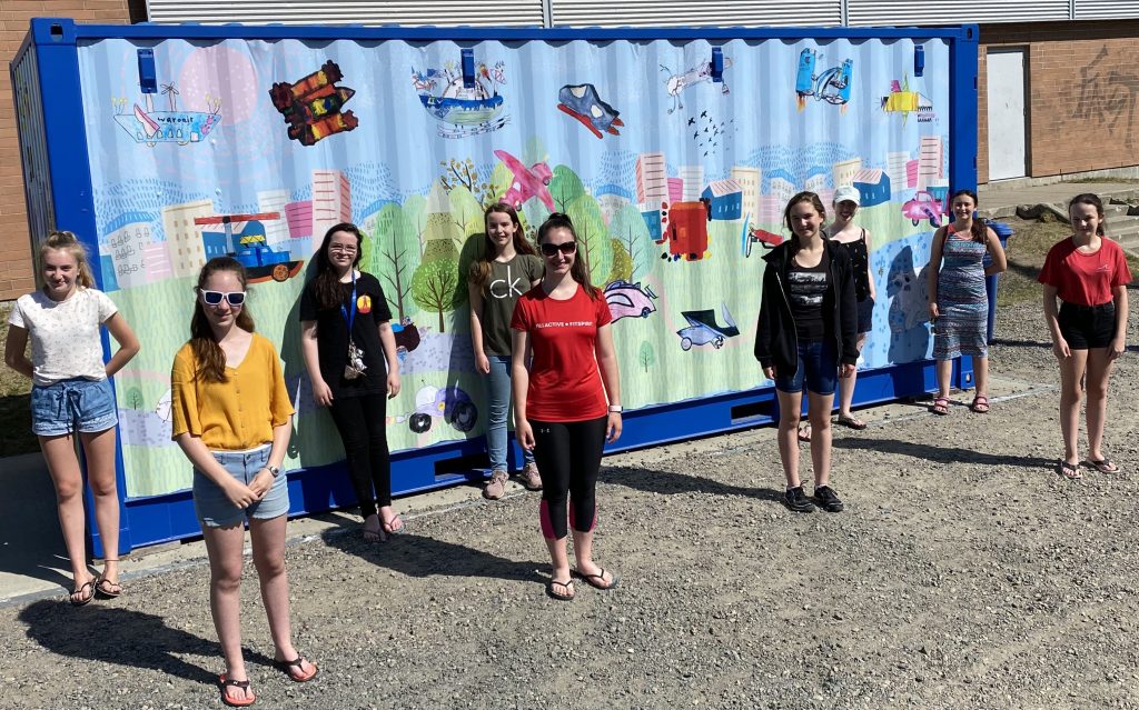 Ayant obtenu les accords pour l’acquisition et l’installation du conteneur, l’enseignante en arts plastiques a reçu du financement ce qui a permis aux élèves d’utiliser différents outils et matériaux (aquarelle, carton, pastel, peinture acrylique, argile, etc.). Les œuvres retenues ont été photographiées en décembre et transmises à un graphiste pour le montage. La compagnie Mono Lino, spécialisée dans des impressions grand format, a produit l’emballage final dont la pose a été faite récemment.