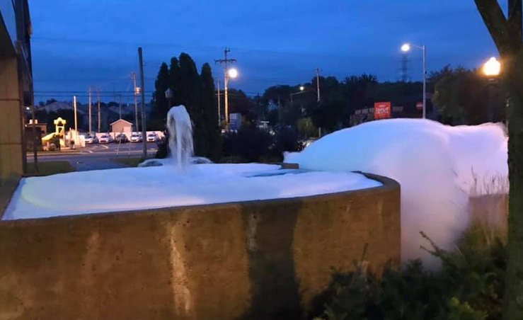INUSITÉ. La page Facebook de Spotted Val-Bélair a publié ce matin des photos montrant que la fontaine de la bibliothèque Félix-Leclerc débordait littéralement d’une mousse blanche.