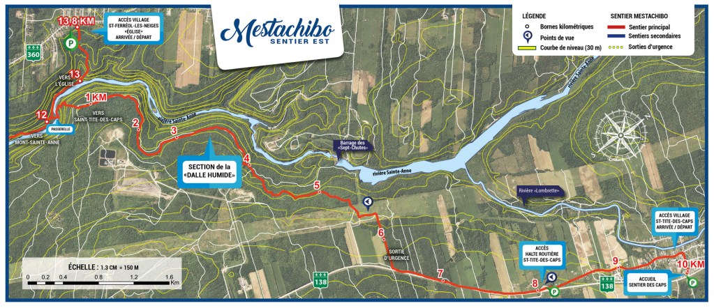 À la suite des importantes précipitations du 25 et 26 décembre dernier, le lien du sentier Mestachibo-Est est maintenant fermé entre Saint-Tite-des-Caps et Saint-Ferréol-les-Neiges. En effet le fort déluge et la crue des eaux sur la rivière Sainte-Anne ont emporté la passerelle suspendue. Une petite passerelle de bois longeant la rivière a elle aussi été emportée par cette crue inhabituelle.