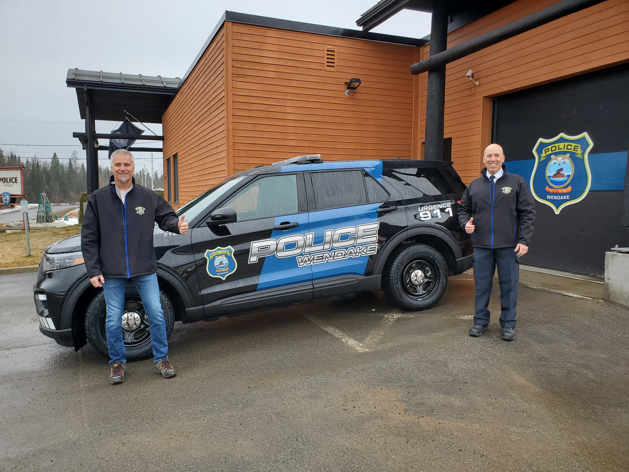 Le chef à la Sécurité publique et le directeur du Service de police de Wendake viennent de dévoiler le nouveau visuel pour les véhicules de patrouille du Service de police.