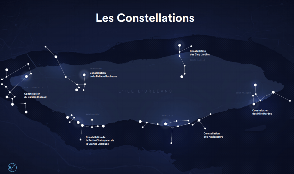 Le projet a été appelé «constellations» car le tracé et le balisage des parcours rappelaient aux étudiants la composition d’une constellation. Les points de repères sont symbolisés comme un réseau connecté. «On voulait que les gens qui parcourent ces sentiers, que ce soit les résidents ou les visiteurs, puissent s’imprégner avec la voix et les souvenirs des gens de l’île. Tout ceci sera narré dans des petites capsules de une à deux minutes à quelques endroits du parcours », a-t-elle précisé.