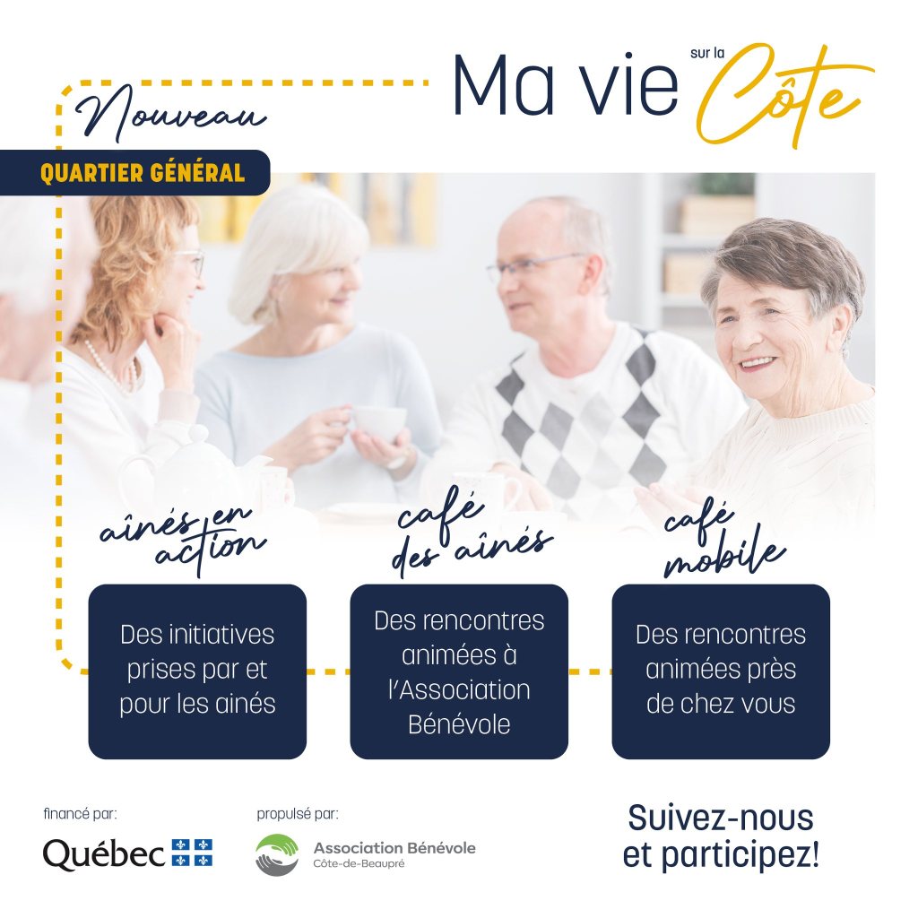 Dans le cadre de sa démarche Ma vie sur la Côte, l’Association Bénévole Côte-de-Beaupré déploie le Quartier Général des Aînés, un projet en trois volets destiné à contrer l’isolement des ainés.