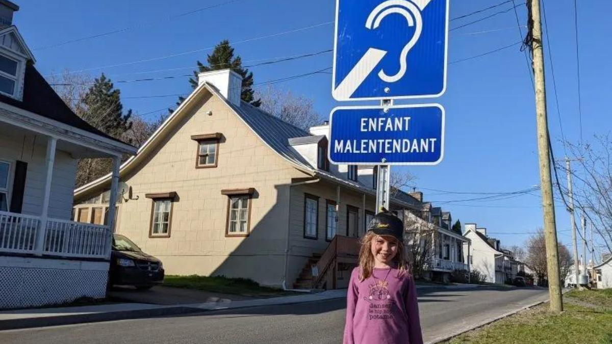Roxanne Julien, résidente de la municipalité de L’Ange-Gardien, est maman de deux enfants, dont l’aînée, Rosalie, 7 ans, est malentendante. Récemment, un panneau a été installé devant chez elle pour aviser les automobilistes de la présence d’une personne sourde dans les environs.