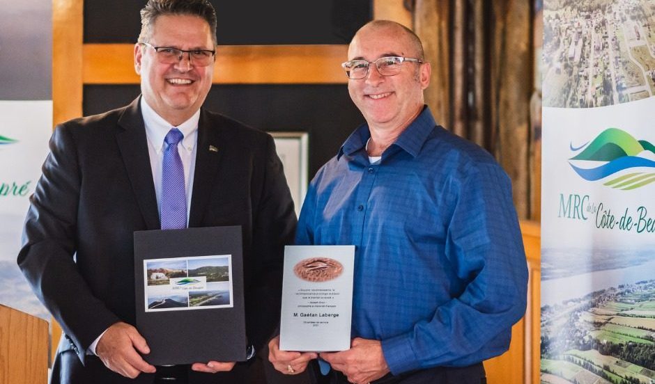 À l’occasion du 40e anniversaire de la MRC de la Côte-de-Beaupré, les années de service de quatre employés ont été soulignées. Sur les photos: Gaétan Laberge, responsable du service de