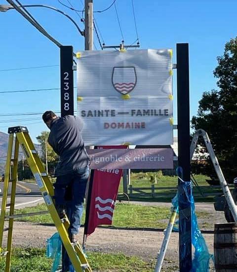 L’installation d’une nouvelle enseigne vient de mettre la touche finale à la nouvelle image du Domaine Sainte-Famille. Le verre représente le vignoble et la cidrerie, les produits. Le blason (la